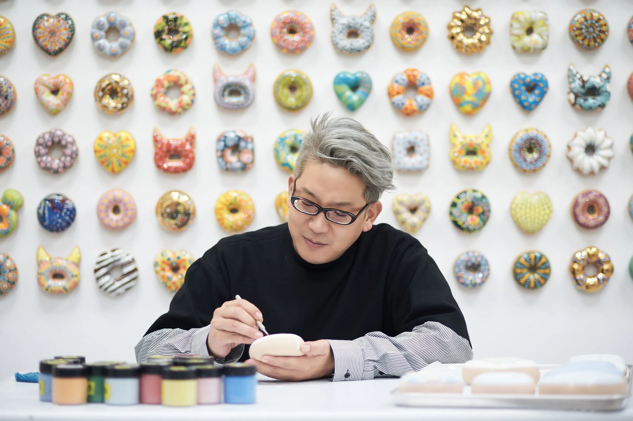 Jae Yong Kim’s donuts are fired with three different types of clays, then finished with glitter, paint and swarovski crystals.